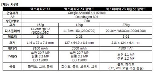 ¿¢½ºÆä¸®¾Æ Z3 ÄÄÆÑÆ® 4Á¾(ºí·¢, È­ÀÌÆ®, ¿À·»Áö, ±×¸°)°ú ¿¢½ºÆä¸®¾Æ Z3 ÅÂºí¸´ ÄÄÆÑÆ® 4Á¾(LTE ¸ðµ¨ ºí·¢, È­ÀÌÆ® ¹× WiFi ¸ðµ¨ ºí·¢, È­ÀÌÆ®)´Â 10¿ù Áß ¼±º¸ÀÏ ¿¹Á¤ÀÌ´Ù