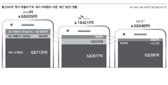 Åë½Å ÀÌ¿ëÀÚ ºÎ´ãÀ» °áÁ¤ÀûÀ¸·Î ³ôÀÎ °ÍÀº °ú´ÙÇÑ ´Ü¸»±â Áö¿øº¸Á¶±Ý µî ´Ã ¹®Á¦°¡ µÆ´ø ¸¶ÄÉÆÃ ºñ¿ëÀ¸·Î, ÀڽŵéÀÌ Á¤ÇÑ °¡À̵å¶óÀκ¸´Ù 18Á¶¿øÀ» ´õ ÁöÃâÇß´Ù°í °¨»ç¿øÀº Æò°¡Çß´Ù. ¾Õ¼ 2010³â Åë½Å 3»ç´Â ´Ü¸»±â º¸Á¶±Ý°ú °¡ÀÔÀÚ À¯Ä¡¿Í À¯Áö¸¦ À§ÇØ ´ë¸®Á¡¿¡ Áö±ÞÇÏ´Â Áö±Þ¼ö¼ö·á µî ¸¶ÄÉÆÃºñÀÇ Çѵµ¸¦ ¸ÅÃâ¾× ´ëºñ 22%, 2011³âºÎÅÍ 20%·Î ³·Ãß±â·Î ÇÏ´Â ¡®¸¶ÄÉÆÃºñ °¡À̵å¶óÀΡ¯¿¡ ¹æ¼ÛÅë½ÅÀ§¿øÈ¸¿Í ÇÔ²² ÇÕÀÇÇß´Ù. ±×·¯³ª À̹ø °¨»ç¿¡¼ ¾Ë ¼ö ÀÖµí ÀÌ ¾à¼ÓÀº ÁöÄÑÁöÁö ¾Ê¾Ò´Ù. À̸¦ °ü¸®ÇØ¾ß ÇÒ ¹Ì·¡ºÎ¿Í ¹æÅëÀ§´Â °³ÀÔÇÏÁö ¾Ê¾Ò´Ù. ÀÌ ±Ý¾×Àº ±×´ë·Î ¿ø°¡¿¡ ¹Ý¿µµÅ Åë½Å¿ä±ÝÀ¸·Î Àü°¡µÆ´Ù. °á±¹ ´Ü¸»±â¸¦ ÀÚÁÖ ¹Ù²Ù´Â »ç¶÷ÀÇ ´Ü¸»±â Áö¿ø±ÝÀ» ´Ü¸»±â¸¦ ¹Ù²ÙÁö ¾Ê´Â ¼ÒºñÀڵ鵵 ¹°°í ÀÖ´Â ¼ÀÀÌ´Ù.