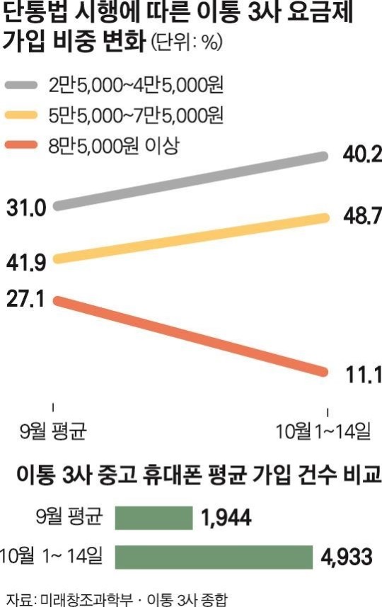 ´ÜÅë¹ý ½ÃÇà ÀÌÈÄÀÎ 1~14ÀϱîÁö ¿ä±ÝÁ¦º° ÀÌÅë 3»çÀÇ Æò±Õ °¡ÀÔÀÚ ºñÁßÀ» º¸¸é ¿ù 4¸¸5,000¿ø ÀÌÇÏ´Â 40.2%·Î ¹ý ½ÃÇà ÀüÀÎ 9¿ù Æò±Õ 31%º¸´Ù 9.2% Æ÷ÀÎÆ®°¡ Áõ°¡Çß°í, ¿ù 5¸¸5,000~7¸¸5,000¿ø Áß°£ ¿ä±ÝÁ¦ ºñÁßÀº 48.7%·Î 9¿ù Æò±Õ 41.9%º¸´Ù 6.8% Æ÷ÀÎÆ® ´Ã¾ú´Ù. ¹Ý¸é ¿ù 8¸¸¿ø´ë ÀÌ»ó °í°¡ ¿ä±ÝÁ¦ °¡ÀÔÀÚ ºñÁßÀº 14ÀÏ ÇöÀç 11.1%·Î, 9¿ù Æò±Õ 27.1%º¸´Ù 16% Æ÷ÀÎÆ® °¨¼ÒÇß´Ù. °ú°Å °í¾× º¸Á¶±ÝÀÇ ÃֽůùÀ» ¾Õ¼¼¿ö °í°¡ ¿ä±ÝÁ¦·Î À¯ÀÎÇÏ´ø °üÇàÀÌ »ç¶óÁö¸é¼ ÁߤýÀú°¡ ¿ä±ÝÁ¦ °¡ÀÔÀÚ°¡ ´Ã°í ÀÖ´Â °ÍÀÌ´Ù.