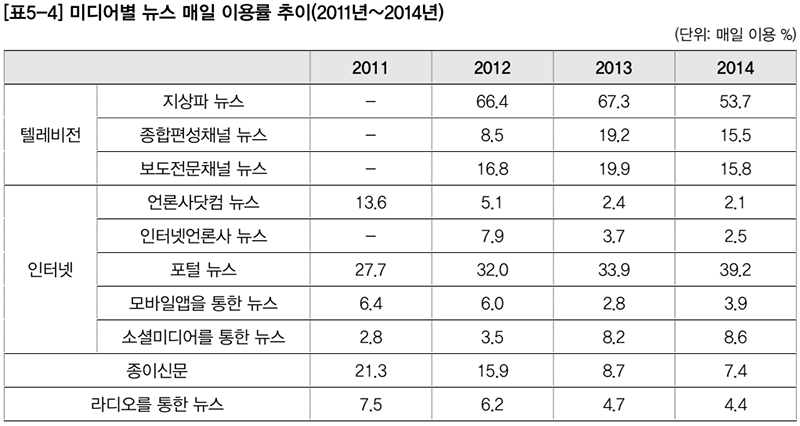 ¡®¹Ìµð¾îº° ´º½º ¸ÅÀÏ ÀÌ¿ë·ü ÃßÀÌ¡¯ Ç׸ñÀ» º¸¸é ÀÚ¼¼ÇÑ °á°ú¸¦ ¾Ë ¼ö ÀÖ½À´Ï´Ù. ÀüÅëÀûÀÎ ´º½º Àü´Þ ¸ÅüÀÎ Áö»óÆÄ¿Í º¸µµÀü¹®Ã¤³Î, ¾ð·Ð»ç´åÄÄ, ÀÎÅÍ³Ý ¾ð·Ð»ç µîÀº ¸ðµÎ ÀÌ¿ë·üÀÌ ´«¿¡ ¶ç°Ô ÁÙ¾îµé¾ú½À´Ï´Ù. 2013³â Áö»óÆÄÀÇ ´º½º¸¦ ¸ÅÀÏ ÀÌ¿ëÇϰí ÀÖ´Ù°í ´ë´äÇÑ À̵éÀº 67.3% ¿´´Âµ¥, 2014³â¿¡´Â 53.7%·Î ¶³¾îÁ³½À´Ï´Ù. º¸µµÀü¹®Ã¤³ÎÀÇ ´º½º¸¦ ¸ÅÀÏ º¸°í ÀÖ´Ù°í ´äÇÑ À̵鵵 2013³â 19.9%¿¡¼ 2014³â 15.8%·Î ÁÙ¾îµé¾ú½À´Ï´Ù.