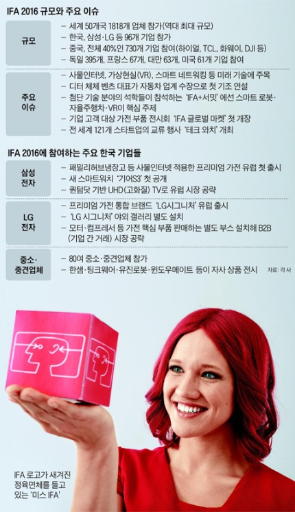 [¼¼°è 3´ë IT¡¤°¡Àü¼î¡¦ ¹Ì¸® º¸´Â 'º£¸¦¸° IFA 2016'] °¢Á¾ ±â±â¸¦ ÀÎÅÍ³Ý ÅëÇØ ¿¬°á, »ç¹°ÀÎÅͳݡ¤°¡»óÇö½Ç ÁýÁß Á¶¸í µðÅÍ Ã¼Ã¼ º¥Ã÷ ÀÚµ¿Â÷ ºÎ¹® ´ëÇ¥¡¦ ó³¾÷°è ¼öÀåÀÌ »ç»ó ù ±âÁ¶¿¬¼³ ½º¸¶Æ®È¨¡¤ÇÁ¸®¹Ì¾ö °¡Àü µî Çѱ¹ Á¦Ç°µé À¯·´ °¡Àü½ÃÀå °ø·« »ï¼º ±â¾îS3 ù °ø°³·Î ½ÃÀå ¼±Á¡, LG´Â °¡Àü ºÎǰ ½ÃÀå¿¡ µµÀüÀå 'TV¡¤³ÃÀå°í¡¤½º¸¶Æ®Æù¿¡¼ ÀÚµ¿Â÷±îÁö ¸ðµç ±â±â°¡ ¼ÒÅëÇÑ´Ù.' ³»´Þ 2~7ÀÏ(ÇöÁö ½Ã°¢) µ¶ÀÏ º£¸¦¸°¿¡¼ ¿¸®´Â À¯·´ ÃÖ´ë °¡Àü¹Ú¶÷ȸÀÎ 'IFA 2016'ÀÇ ÇÙ½É Å°¿öµå´Â ¿¬°á(connected)ÀÌ´Ù. TV¡¤³ÃÀå°í °°Àº °¡ÀüÁ¦Ç°°ú ½º¸¶Æ®Æù¡¤½º¸¶Æ®¿öÄ¡ µî ¸ð¹ÙÀÏ ±â±â, ±×¸®°í ÀÚµ¿Â÷±îÁö ¸ðµç ±â±â°¡ ÀÎÅͳÝÀ» ÅëÇØ ¿¬°áµÇ´Â ¹Ì·¡ÀÇ ½º¸¶Æ® Á¦Ç° ½ÃÀåÀ» Á¦½ÃÇÑ´Ù. °¢Á¾ ±â±â¿¡ ÀÎÅÍ³Ý Åë½Å ±â´ÉÀ» ³Ö¾î ¼·Î ¿¬°áÇÏ´Â »ç¹°ÀÎÅͳÝ(IoT)°ú ÇÔ²² °¡»óÇö½Ç(VR)µµ Â÷¼¼´ë ÇÙ½É ±â¼ú·Î ÁýÁß Á¶¸íµÈ´Ù. »ï¼ºÀüÀÚ¿Í LGÀüÀÚµµ ÀÌ·± ÷´Ü ±â¼úÀ» Àû¿ëÇØ ¸¸µç ÇÁ¸®¹Ì¾ö Á¦Ç°À» ¾Õ¼¼¿ö À¯·´½ÃÀå °ø·«¿¡ ³ª¼±´Ù. ¸Å³â 9¿ù ¿¸®´Â IFA´Â ¹Ì±¹ ¶ó½ºº£À̰Žº¿¡¼ ¿¸®´ÂCES(Consumer Electronics Show), ½ºÆäÀÎ ¹Ù¸£¼¿·Î³ªÀÇ MWC(Mobile World Congress)¿Í ÇÔ²² ¼¼°è 3´ë Á¤º¸±â¼ú(IT)¡¤°¡ÀüÁ¦Ç° Àü½Ãȸ·Î ²ÅÈù´Ù. ¡Þ»ï¼º¡¤LG, ½º¸¶Æ®È¨¡¤ÇÁ¸®¹Ì¾ö °¡ÀüÀ¸·Î À¯·´ ½ÃÀå °ø·«¡¦ B2B ½ÃÀåµµ °³Ã´ ³ª¼ ¿ÃÇØ Âü°¡ ¾÷ü °¡¿îµ¥ °¡Àå Å« Àü½Ã °ø°£À» ¸¶·ÃÇÑ »ï¼ºÀüÀÚ´Â °¡ÀüÁ¦Ç°°ú ¸ð¹ÙÀÏ, ¿þ¾î·¯ºí(Âø¿ëÇü) ±â±â µîÀÌ ¸ðµÎ ¿¬°áµÇ´Â '½º¸¶Æ®È¨'À» Ű¿öµå·Î °¢Á¾ ½ÅÁ¦Ç°À» ³»³õ´Â´Ù. »ç¹°ÀÎÅÍ³Ý ±â¼úÀ» ±¸ÇöÇÑ 'ÆÐ¹Ð¸®Çãºê' ³ÃÀå°í°¡ °£ÆÇ Á¦Ç°. ÆÐ¹Ð¸®Çãºê ³ÃÀå°í´Â ¿ÜºÎ¿¡¼ ½º¸¶Æ®ÆùÀ¸·Î À¯Åë±â°£ÀÌ Áö³ ½ÄǰÀÌ ÀÖ´ÂÁö, ºÎÁ·ÇÑ ½ÄǰÀº ¾ø´ÂÁö È®ÀÎÇϰí ÀÎÅͳÝÀ¸·Î ±¸¸Åµµ ÇÒ ¼ö ÀÖ´Ù. Áֹ濡¼ TVȸé°ú À½¾Çµµ Áñ±â°í, TV¡¤¿¡¾îÄÁµµ Á¦¾îÇÒ ¼ö ÀÖ´Ù. ¼¼Å¹ Áß¿¡µµ °£ÆíÇÏ°Ô ¼¼Å¹¹°À» Ãß°¡ÇÒ ¼ö ÀÖ´Â µå·³¼¼Å¹±â '¾Öµå¿ö½Ã', ¹Ì±¹ µ¹ºñ»çÀÇ Ã·´Ü ÀÔüÀ½Çâ ±â¼úÀ» Àû¿ëÇÑ »ç¿îµå¹ÙÀÎ 'HW-K950' µîµµ À¯·´¿¡¼ ù¼±À» º¸ÀδÙ. ![]() »ï¼ºÀüÀÚ´Â IFA °³¸· ÀÌÆ² ÀüÀÎ ¿À´Â 31ÀÏ ½º¸¶Æ®¿öÄ¡ ½ÅÁ¦Ç°ÀÎ '±â¾îS3'µµ óÀ½ °ø°³ÇÑ´Ù. ³»´Þ 7ÀÏ·Î ¾Ë·ÁÁø ¾ÖÇÃÀÇ '¾ÖÇÿöÄ¡2' °ø°³¿¡ ¾Õ¼ ½ÃÀå ¼±Á¡¿¡ ³ª¼°Ú´Ù´Â °ÍÀÌ´Ù. LGÀüÀÚ´Â ÇÁ¸®¹Ì¾ö °¡Àü ºê·£µåÀÎ 'LG ½Ã±×´Ïó'¸¦ À¯·´ °ø·«ÀÇ ¹«±â·Î ³»¼¼¿ü´Ù. ÀÌ¹Ì Ãâ½ÃÇÑ OLED(À¯±â¹ß±¤´ÙÀÌ¿Àµå) TV ¿Ü¿¡ ³ÃÀå°í¡¤¼¼Å¹±â¡¤°ø±âûÁ¤±â µî LG½Ã±×´Ïó Á¦Ç°±ºÀ» óÀ½À¸·Î À¯·´ ½ÃÀå¿¡ ³»³õ´Â °ÍÀÌ´Ù. À̸¦ À§ÇØ IFA Àü½ÃÀå ¾ß¿Ü Á¤¿ø¿¡ 1375§³(¾à 416Æò) ±Ô¸ð·Î º°µµÀÇ Àü¿ë Àü½Ã °ø°£ÀÎ 'LG ½Ã±×´Ïó °¶·¯¸®'¸¦ ¸¸µç´Ù. LGÀüÀÚ´Â B2B(±â¾÷ °£ °Å·¡) ½ÃÀåÀ» °Ü³ÉÇØ û¼Ò±â¡¤¼¼Å¹±â¿ë ¸ðÅÍ¿Í ³ÃÀå°í¡¤¿¡¾îÄÁ¿ë ÄÄÇÁ·¹¼(³Ã¸Å ¾ÐÃà±â) µî °¡Àü ºÎǰ ½ÃÀå¿¡µµ ¹ßÀ» ³»µðµò´Ù. LGÀüÀÚ´Â ¿ÃÇØ óÀ½ ¿î¿µµÇ´Â °¡ÀüºÎǰ Àü½ÃÀåÀÎ 'IFA ±Û·Î¹ú ¸¶ÄÏ'¿¡ º°µµ ºÎ½º¸¦ ¸¶·Ã, ÇÙ½É ºÎǰ 30¿© Á¾À» Àü½ÃÇÑ´Ù. ¡ÞÀÚµ¿Â÷¾÷°è ¼öÀåÀÌ Ã¹ ±âÁ¶¿¬¼³¡¦ »ç¹°ÀÎÅͳݡ¤°¡»óÇö½Ç µîÀÌ ÈµÎ À̹ø IFA¿¡¼ ÁÖ¸ñ¹Þ´Â ¹Ì·¡ ±â¼úÀº »ç¹°ÀÎÅͳݰú VR(°¡»óÇö½Ç), ½º¸¶Æ®È¨ ³×Æ®¿öÅ· µîÀÌ´Ù. ƯÈ÷ ¿ÃÇØ¿£ ÀÚµ¿Â÷¾÷°è ¼öÀåÀÌ »ç»ó óÀ½À¸·Î ±âÁ¶¿¬¼³ÀÚ·Î ³ª¼±´Ù. µðÅÍ Ã¼Ã¼ ¸Þ¸£¼¼µ¥½º-º¥Ã÷ ÀÚµ¿Â÷ ºÎ¹® ´ëÇ¥´Â 9¿ù 2ÀÏ '±Ã±ØÀÇ ¸ð¹ÙÀÏ ±â±â-°íǰÁú ŸÀÓ¸Ó½ÅÀ¸·Î¼ÀÇ ÀÚµ¿Â÷'¶ó´Â ÁÖÁ¦·Î ¿¬¼³ÇÑ´Ù. °¡ÀüÁ¦Ç°ÀÌ Áý¾È¿¡¼ ¼·Î ¿¬°áµÇ´Â °ÍÀ» ³Ñ¾î µµ·Î¸¦ ´Þ¸®´Â ÀÚÀ²ÁÖÇàÂ÷¿Íµµ À¶ÇյǴ ¹Ì·¡»óÀÌ Á¦½ÃµÇ´Â °ÍÀÌ´Ù. ¼¼°è 2À§ CPU(Áß¾Óó¸®ÀåÄ¡) Á¦Á¶ ¾÷üÀÎ ¹Ì±¹ AMDÀÇ ¸¶Å© ÆäÀÌÆÛ¸Å½ºÅÍ ÃÖ°í±â¼úÃ¥ÀÓÀÚ(CTO)´Â VRÀÌ ÇコÄɾ¿£ÅÍÅ×ÀÎ¸ÕÆ®¡¤±³À°¡¤ÆÐ¼Ç µî ¸ðµç »ê¾÷ ºÐ¾ß¿¡¼ ÀÏÀ¸Å°´Â º¯È»óÀ», ¹Ì±¹ IBMÀÇ ÇØ¸®¾ù ±×¸° ÃѰý»çÀåÀº »ç¹°ÀÎÅͳݰú ÀΰøÁö´É(AI)À» ÅëÇÑ »îÀÇ º¯È¿¡ ´ëÇØ ±âÁ¶°¿¬À» ÇÑ´Ù. ÷´Ü±â¼ú ºÐ¾ßÀÇ ¼®Çаú ±â¼úÀÚµéÀÌ Âü¼®ÇÏ´Â ¼¼¹Ì³ªÀÎ 'IFA+ ¼¹Ô'¿¡¼µµ 'µðÁöÅÐ »çȸ¸¦ ޱ¸ÇÏ´Ù'¶ó´Â ÁÖÁ¦·Î ½º¸¶Æ® ·Îº¿°ú ÀÚÀ²ÁÖÇàÂ÷, VRÀÌ ÇÙ½É ÁÖÁ¦·Î ´Ù·ïÁø´Ù. ¿ÃÇØ IFA¿£ Àü ¼¼°è 50°³±¹ 1818°³ °¡Àü¾÷ü°¡ Âü°¡ÇØ ¿ª´ë ÃÖ´ë ±Ô¸ð·Î ¿¸°´Ù. ¿ì¸®³ª¶ó´Â »ï¼ºÀüÀÚ¿Í LGÀüÀÚ µî 96°³ ¾÷ü°¡ Âü¿©ÇÑ´Ù. Áß±¹¿¡¼± ÀüüÀÇ 40%¿¡ ´ÞÇÏ´Â 730°
