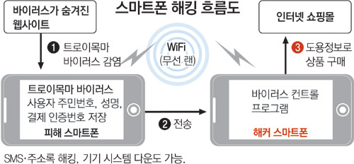 ÀÌ ±³¼ö´Â ÇØÅ·À» ½Ã¿¬Çϱâ À§ÇØ À¥»çÀÌÆ®¸¦ ÅëÇØ ÇÇÇØÀÚÀÇ ±â±â¿¡ °¨¿°µÇ´Â Æ®·ÎÀ̸ñ¸¶ ¹ÙÀÌ·¯½º(½Ã½ºÅÛ¿¡ ¼û¾î ƯÁ¤ Á¤º¸¸¦ »©³»´Â ¹ÙÀÌ·¯½º)¸¦ ¸¸µé¾ú´Ù. ¹«¼± ·£À¸·Î ¹ÙÀÌ·¯½º°¡ ÀÖ´Â À¥»çÀÌÆ®¿¡ Á¢¼ÓÇß´Ù°¡ °¨¿°µÈ ÇÇÇØÀÚÀÇ ±â±â´Â »ç¿ëÀÚ°¡ ¼ºÀÎ ÀÎÁõ µîÀ» ¹Þ±â À§ÇØ ÀÔ·ÂÇÑ Áֹεî·Ï¹øÈ£¿Í À̸§, ÀüȹøÈ£¸¦ ¸ô·¡ ÀúÀåÇß°í ÇØÄ¿ÀÇ ½º¸¶Æ®Æù¿¡ ³»ÀåµÈ ¹ÙÀÌ·¯½º ÄÁÆ®·Ñ ÇÁ·Î±×·¥ÀÌ ¹«¼± ·£À¸·Î À̸¦ »©³Â´Ù.