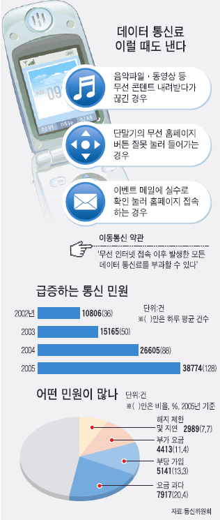 Áö³ÇØ ¹«¼± ÀÎÅÍ³Ý ¿ä±Ý µî À̵¿Åë½Å ¼ºñ½º¿¡ ºÒ¸¸À» °®°í ¼ÒºñÀÚº¸È£¿ø¿¡ »ó´ãÇÑ »ç·Ê°¡ 1¸¸6441°Ç(2004³â 9610°Ç)¿¡ À̸¥´Ù. ¼Òº¸¿ø ÃÖÀº½Ç Á¤º¸Åë½ÅÆÀÀåÀº £¢¿äÁò ¹«¼± µ¥ÀÌÅÍ °ü·Ã »ó´ãÀÌ ¸¹´Ù£¢°í ¸»Çß´Ù.