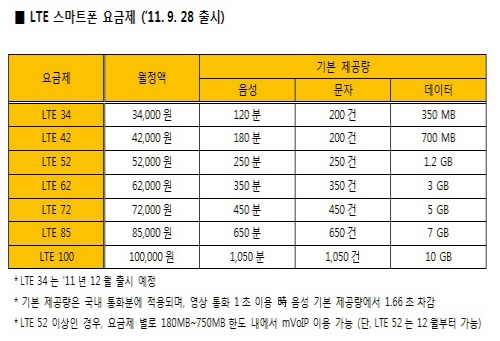 Á¤¾×Á¦´Â ¡ãLTE 34(12¿ù ¿¹Á¤) ¿ù 3¸¸4000¿ø ¡ãLTE 42 ¿ù 4¸¸2000¿ø ¡ãLTE 52 ¿ù5¸¸2000¿ø ¡ãLTE 62 ¿ù 6¸¸2000¿ø ¡ãLTE 72 ¿ù 7¸¸2000¿ø ¡ãLTE 85 ¿ù 8¸¸5000¿ø ¡ãLTE 100 ¿ù 10¸¸¿ø µî 7Á¾ÀÌ´Ù. ¸ð¹ÙÀÏÀÎÅͳÝÀüÈ­(mVoIP)´Â LTE 52 ÀÌ»ó ¿ä±ÝÁ¦ »ç¿ëÀÚ°¡ Á¦ÇÑÀûÀ¸·Î ÀÌ¿ëÇÒ ¼ö ÀÖ´Ù.