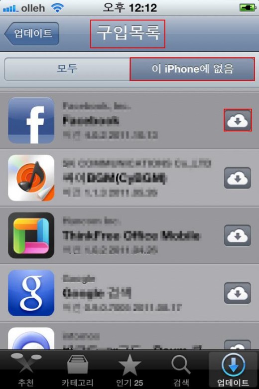 ¾÷µ¥ÀÌÆ® ¸Þ´º¿¡ µé¾î°¡¸é ¡®±¸ÀÔ¸ñ·Ï¡¯ÀÌ ³ª¿Â´Ù. ¡®iOS5¡¯ ¾÷µ¥ÀÌÆ® ÀÌÀü¿¡ ´Ù¿î·ÎµåÇß´ø ¾ÛÀÇ ±¸ÀÔ¸ñ·ÏµéÀÌ´Ù.
