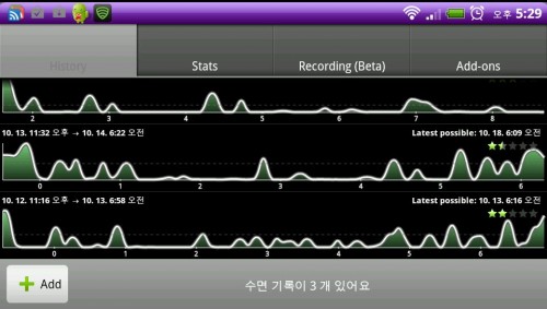 ¡®½½¸³ ¾ÖÁî ¾Èµå·ÎÀ̵塯(Sleep-as-an-Droid)´Â ÀÌ·± ÃëħÀÚÀÇ ¼ö¸é»óŸ¦ ÆÄ¾ÇÇÒ ¼ö ÀÖ°Ô µµ¿ÍÁÖ´Â ¾ÛÀÌ´Ù. ÀáÀÚ¸® ¸Ó¸® ¸Ã¿¡ ÀÌ ¾ÛÀ» ½ÇÇàÇϰí ÀáÀÌ µé¸é, ½º¸¶Æ®ÆùÀ» ÅëÇØ Áøµ¿°ú ¼Ò¸®¸¦ ¼öÁýÇÑ´Ù. ÀÌ Áøµ¿°ú ¼Ò¸®¸¦ ¹ÙÅÁÀ¸·Î ¹ã»õ ÃëħÀÚ°¡ ¾î¶»°Ô ÀáÀ» ÀÚ´ÂÁö¸¦ ±×·¡ÇÁ·Î ±×·Á¼ º¸¿©ÁØ´Ù. ¹ã»õ ¾ó¸¶³ª µÚô¿´´ÂÁö ÆÄ¾ÇÇÒ ¼ö ÀÖÀ¸¸ç ¾ðÁ¦ ÀáÀÌ µé¾î¾ß ÀûÀýÇÒ Áö ¾Ë·ÁÁØ´Ù.