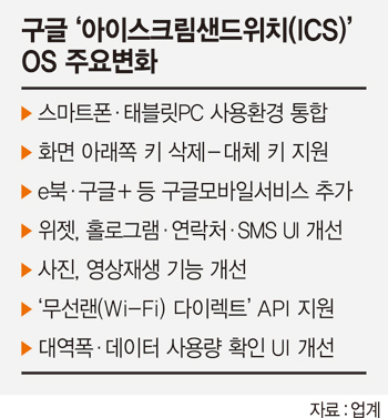 Áö³ 12ÀÏ ¾ÖÇÃÀÌ £§¾ÆÀÌÆù¡¤¾ÆÀÌÆÐµå£§¿ë £§iOS5£§¸¦ Á¦°øÇϱ⠽ÃÀÛÇÑ µ¥ À̾î, ±¸±Ûµµ »õ·Î °³¹ßÇÑ ½º¸¶Æ®Æù¡¤ÅÂºí¸´PC¿ë ÅëÇÕ OS £§¾ÆÀ̽ºÅ©¸²»÷µåÀ§Ä¡(ICS)£§¸¦ Á¶¸¸°£ °ø°³ÇÑ´Ù. »ï¼ºÀüÀڴ ù ¹øÂ° ICSÆù £§°¶·°½Ã³Ø¼½º£§¸¦ °ø°³ÇÏ¸ç ±¸±Û¿¡ ´ëÇÑ ¸·ÈÄ Áö¿ø¿¡ ³ª¼³ ¿¹Á¤ÀÌ´Ù.