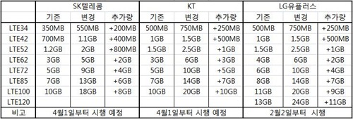 SKÅÚ·¹ÄÞÀº 3¿ù28ÀÏ LTE ¿ä±ÝÁ¦ÀÇ µ¥ÀÌÅÍ Á¦°ø·® È®´ë¿Í µ¥ÀÌÅÍ Ãʰú¿ä±Ý »óÇÑÁ¦ µµÀÔÀ» °ñÀÚ·Î ÇÏ´Â LTE ¿ä±Ýü°è °³Æí¾ÈÀ» ¹ßÇ¥Çß´Ù. ÀÌ¾î¼ KTµµ µ¥ÀÌÅÍ ±âº» Á¦°ø·®À» ÃÖ´ë 2¹è±îÁö È®´ëÇϰڴٰí 3¿ù29ÀÏ ¹àÇû´Ù. KTÀÇ µ¥ÀÌÅÍ Á¦°ø·®Àº SKÅÚ·¹ÄÞº¸´Ù ´Ù¼Ò ¸¹°í LGÀ¯Ç÷¯½º¿Í µ¿ÀÏÇÑ ¼öÁØÀÌ´Ù. Åë½Å3»çÀÇ LTE µ¥ÀÌÅÍ Á¦°ø·®À» Á¤¸®ÇÏ¸é ¾Æ·¡¿Í °°´Ù.