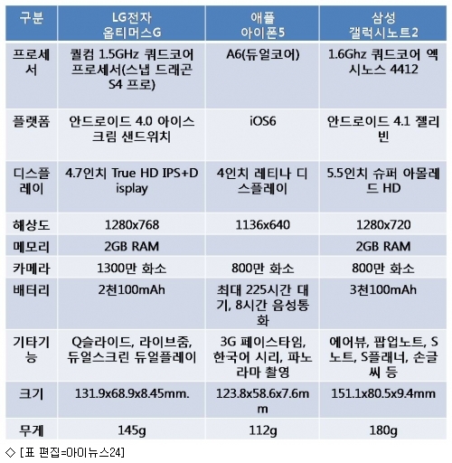¿î¿µÃ¼Á¦ Ãø¸é¿¡¼­´Â °¶·°½Ã³ëÆ®2(±¸±Û Á©¸®ºó)¿Í ¾ÆÀÌÆù5(iOS6)°¡ ÃֽйöÀüÀ» žÀçÇÑ µ¥ ¹ÝÇØ ¿ÉƼ¸Ó½ºG´Â ±¸±Û ¾ÆÀ̽ºÅ©¸²»÷µåÀ§Ä¡¿¡ ¸Ó¹°·¶´Ù. LGÀüÀÚ´Â ¿ÃÇØ ¾È¿¡ ¿ÉƼ¸Ó½ºG¸¦ Á©¸®ºóÀ¸·Î ¾÷±×·¹À̵åÇÒ ¼ö ÀÖµµ·Ï Áö¿øÇÑ´Ù°í ¹àÇû´Ù.