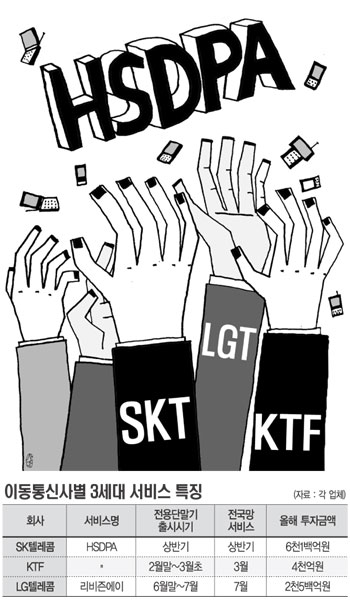 SKÅÚ·¹ÄÞ°ú KTF, LGÅÚ·¹ÄÞÀÌ Â÷¼¼´ë À̵¿Åë½Å ±â¼úÀÎ ¿µ»ó¡¤µ¥ÀÌÅͰí¼ÓÀü¼Û¹æ½Ä(HSDPA) ¼­ºñ½º¸¦ ¾ÕµÎ°í ÇÑÆÇ ¡®Áø°Ë¡¯ ½ÂºÎ¸¦ Áغñ ÁßÀÌ´Ù. 3¼¼´ë(G) À̵¿Åë½ÅÀ¸·Î ºÒ¸®´Â HSDPA´Â ÈÞ´ëÀüÈ­·Î È­»óÅëÈ­°¡ °¡´ÉÇÏ¸ç ¿µÈ­³ª ³ë·¡ µî °¢Á¾ µ¥ÀÌÅ͸¦ Ãʰí¼ÓÀ¸·Î ³»·Á¹Þ°Å³ª ¿Ã·Á¹ÞÀ» ¼ö ÀÖ´Ù. ÀÌµé ¾÷ü´Â Æ÷È­»óÅ¿¡ À̸¥ ±¹³» ÀÌÅë½ÃÀå¿¡ HSDPA°¡ ¸ÅÃâ ¼ºÀå µî »õ·Î¿î µ¹ÆÄ±¸¸¦ ¸¶·ÃÇØ ÁÙ °ÍÀ¸·Î ±â´ëÇÏ¸ç ¿ÃÇØºÎÅÍ ÁýÁßÀûÀÎ ¼³ºñ ÅõÀÚ¿Í °¡ÀÔÀÚ È®º¸ Àü·«À» ÆîÄ¥ °èȹÀÌ´Ù.