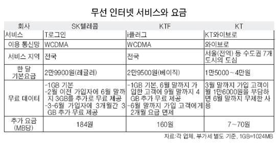 KTF( iÇ÷¯±×)ÀÇ ¿ä±Ý ±¸Á¶µµ ÀÌ¿Í ºñ½ÁÇÏ´Ù. ±âº» »óǰÀÇ °æ¿ì 2¸¸9500¿ø(ºÎ°¡¼¼ º°µµ)ÀÇ ¿ä±ÝÀ» ³»¸é 1GBÀÇ µ¥ÀÌÅ͸¦ ¹«·á·Î »ç¿ëÇÒ ¼ö ÀÖ´Ù. 6¿ù 30ÀϱîÁö °¡ÀÔÇϸé 2°³¿ù°£ ¿ä±ÝÀÌ ¸éÁ¦µÇ°í 9¿ù ¸»±îÁö 4GB¸¦ Ãß°¡·Î ¹«·á »ç¿ëÇÒ ¼ö ÀÖ´Ù. ±×·¯³ª ±âº» µ¥ÀÌÅ͸¦ ³ÑÀ¸¸é 1MB´ç 160¿øÀÇ ¿ä±ÝÀÌ ºÎ°úµÈ´Ù. KTÀÇ ¿ÍÀ̺ê·Î ¼ºñ½ºµµ ÀÌ´Þ ¸»±îÁö °¡ÀÔÇÏ´Â °í°´µé¿¡°Ô 6¿ù ¸»±îÁö ¿ù 1¸¸6000¿ø¿¡ ÀÎÅͳÝÀ» ¹«Á¦ÇÑ ¾µ ¼ö ÀÖµµ·Ï Çß´Ù. ±×·¯³ª 7¿ùºÎÅÍ´Â ÀÏÁ¤ÇÑ ±âº» ¿ä±Ý¿¡ Ãß°¡ ¿ä±ÝÀ» ³»´Â ÇüÅ·ΠÀüȯµÈ´Ù.