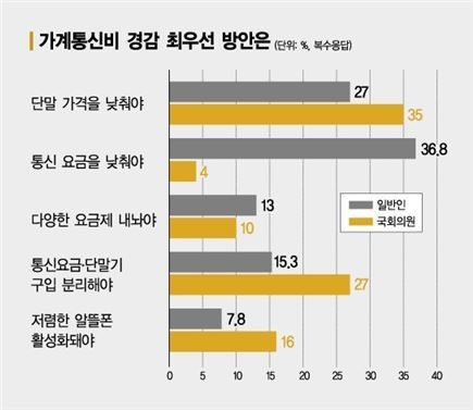 °¡°èÅë½Åºñ¸¦ ³·Ãß±â À§ÇÑ ÃÖÀûÀÇ ¹æ¾ÈÀ¸·Î´Â £§ÀÌÅë»ç°¡ ¿ä±ÝÀ» ³·Ãç¾ß ÇÑ´Ù£§(38.6%)°¡ °¡Àå ¸¹¾Ò´Ù. ÀÌÅë»ç°¡ Áö³ÇغÎÅÍ °¡ÀÔºñ ´Ü°èÀû ÆóÁö¿Í °°Àº Á¤Ã¥À» ³»³õ¾ÒÁö¸¸ ±¹¹ÎµéÀÌ Åë½Åºñ Àý°¨ È¿°ú¸¦ ´À³¢Áö ¸øÇϰí ÀÖ´Ù´Â °ÍÀ» º¸¿©ÁÖ´Â ´ë¸ñÀÌ´Ù. ÀÌ¾î £§ÈÞ´ëÆù °¡°ÝÀÌ Ç϶ôÇØ¾ß ÇÑ´Ù£§(27%)°¡ 2À§¸¦ ±â·ÏÇØ ´Ü¸» Ãâ°í°¡¿¡ ´ëÇÑ ¼ÒºñÀÚµéÀÇ ºÎ´ãÀ» ¹Ý¿µÇß´Ù. ÀÌ ¹Û¿¡ Åë½Å¼ºñ½º¡¤ÈÞ´ëÆù ºÐ¸® ÆÇ¸Å(15.3%), ´Ù¾çÇÑ °¡°Ý´ëÀÇ Åë½Å¿ä±ÝÁ¦ µîÀå(13%), ¾Ë¶ãÆù Ȱ¼ºÈ(7.8%)°¡ µÚ¸¦ À̾ú´Ù.