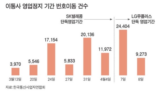 9ÀÏ À̵¿Åë½Å¾÷°è¿¡ µû¸£¸é Áö³ 7~8ÀÏ À̵¿Åë½Å¾÷°èÀÇ ¹øÈ£À̵¿°Ç¼ö°¡ 3¸¸3,518°ÇÀ» ³Ñ¾î¼¹´Ù. Á¤ºÎ¿¡¼´Â À̵¿Åë½Å 3»ç ÇÕÃļ ÇÏ·ç Æò±Õ 2¸¸4,000°ÇÀÇ ¹øÈ£À̵¿ÀÌ ÀϾ¸é ºÒ¹ý º¸Á¶±ÝÀ» »ç¿ëÇØ ½ÃÀåÀÌ °ú¿µÈ °ÍÀ¸·Î º»´Ù. 7ÀÏ¿¡´Â ÁÖ¸»(5,6ÀÏ) °¡ÀÔÀÚ Æ÷ÇÔÇØ 2¸¸4,404°Ç, 8ÀÏ¿¡´Â 9,273°ÇÀÇ ¹øÈ£À̵¿ÀÌ ÀϾ´Ù.