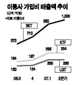 KTF¿Í LGTµµ °¡ÀÔºñ ¸ÅÃâ¾×ÀÌ Áõ°¡Çß´Ù. KTF´Â ¢Ë06³â 2Q 165¾ï¿ø ¢Ë3Q 184¾ï¿ø ¢Ë4Q 197¾ï¿ø ¢Ë07³â 1Q 255¾ï¿ø ¢Ë2Q 254¾ï¿øÀ¸·Î ´Ã¾î³µÀ¸¸ç, LGT´Â ¢Ë06³â 2Q 150¾ï¿ø ¢Ë3Q 150¾ï¿ø ¢Ë4Q 154¾ï¿ø ¢Ë07³â 1Q 200¾ï¿ø ¢Ë2Q 200¾ï¿øÀ» ±â·ÏÇß´Ù.