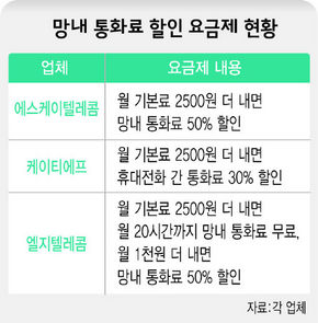 ¿¡½ºÄÉÀÌÅÚ·¹ÄÞ(SKT)Àº Áö³ ´Þ 17ÀÏ ¸Á³» ÅëÈ·á ÇÒÀÎ ¿ä±ÝÁ¦¸¦ µµÀÔÇÑ µÚ·Î Áö±Ý±îÁö ÀÌ ¿ä±ÝÁ¦¸¦ ¼±ÅÃÇÑ °¡ÀÔÀÚ°¡ 55¸¸¸íÀ» ³Ñ¾ú´Ù°í 6ÀÏ ¹àÇû´Ù. ¿¡½ºÄÉÀÌÅÚ·¹ÄÞÀº À̵鿡°Ô ¿ù ±âº»·á·Î 2500¿øÀ» ´õ ¹Þ´Â ´ë½Å ¸Á³» ÅëȷḦ 50% ±ð¾ÆÁÖ°í ÀÖ´Ù. ¿¡½ºÄÉÀÌÅÚ·¹ÄÞ ±èÇýÁø ¸Å´ÏÀú´Â ¡°ÇÏ·ç Æò±Õ 2¸¸5õ¿©¸íÀÌ ¸Á³» ÅëÈ·á ÇÒÀÎ ¿ä±ÝÁ¦·Î ÀüȯÇϰí ÀÖ´Ù¡±¸ç ¡°¿¬¸»Âë¿¡´Â 150¸¸À» ³ÑÀ» °Í °°´Ù¡±°í ¸»Çß´Ù. ÄÉÀÌÆ¼¿¡ÇÁ(KTF)ÀÇ ¸Á³» ÅëÈ·á ÇÒÀÎ ¿ä±ÝÁ¦ ÀÌ¿ëÀÚ´Â 6¸¸¿©¸í, ¿¤ÁöÅÚ·¹ÄÞ(LGT)Àº 4¸¸5õ¸íÀ¸·Î Áý°èµÆ´Ù. ÄÉÀÌÆ¼¿¡ÇÁ´Â ¿ù ±âº»·á·Î 2500¿øÀ» ´õ ¹Þ´Â ´ë½Å ÈÞ´ëÀüÈ °£ ÅëȷḦ ¸ðµÎ 30% ±ð¾ÆÁÖ°í, ¿¤ÁöÅÚ·¹ÄÞÀº ¿ù ±âº»·á·Î 2500¿øÀ» ´õ ¹Þ´Â ´ë½Å ¿ù 20½Ã°£±îÁö´Â ¸Á³» ÅëȷḦ ¹ÞÁö ¾Ê´Â´Ù.