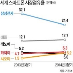 ½ÃÀåÁ¶»ç¾÷ü °¡Æ®³Ê¿¡ µû¸£¸é »ï¼ºÀüÀÚ´Â 3ºÐ±â ½º¸¶Æ®Æù ÆÇ¸Å·®ÀÌ 7321¸¸´ë·Î À۳⠰°Àº ±â°£º¸´Ù 700¸¸´ë ÀÌ»ó ÁÙ¾ú´Ù. ½ÃÀåÁ¡À¯À²Àº 1À§¸¦ ÁöÄ×Áö¸¸ 32.1%¿¡¼ 24.4%·Î 8%Æ÷ÀÎÆ® °¡±îÀÌ ¶³¾îÁ³´Ù. ÃÖ´ë ÆÇ¸Å±¹ÀÎ Áß±¹¿¡¼ ÆÇ¸Å·®ÀÌ 28.6% °¨¼ÒÇß´Ù. »þ¿À¹Ì È¿þÀÌ µî ÇöÁö Á¦Á¶¾÷üµé¿¡ ¹Ð¸° °á°ú´Ù.