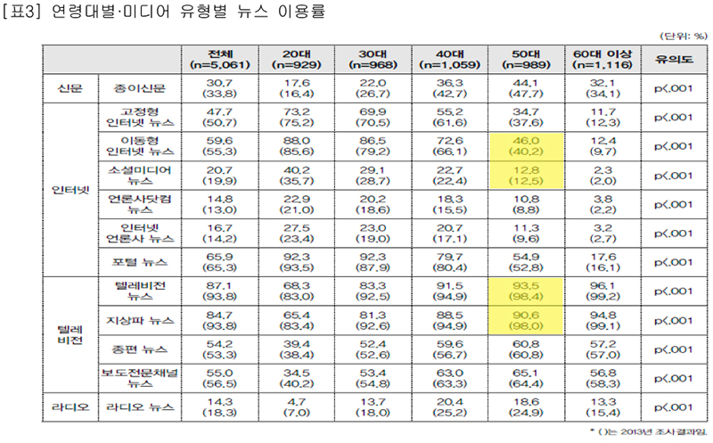 Áö»óÆÄ ´º½º ÀÌ¿ë ºñÀ²Àº ¸ðµç ¿¬·É´ë¿¡¼ ÀÌ¿ë·üÀÌ Ç϶ôÇß½À´Ï´Ù. 2013³â°ú ºñ±³ÇØ 2014³â 9.1%p ¶³¾îÁø °ÍÀ¸·Î Á¶»çµÆ½À´Ï´Ù. ƯÈ÷ 50´ëÀÇ Áö»óÆÄ ´º½º ÀÌ¿ë ºñÀ²Àº 2013³â 98.0%¿¡¼ 2014³â 90.6%·Î 7.4%p³ª ¶³¾îÁø °ÍÀ¸·Î ³ªÅ¸³µ½À´Ï´Ù.