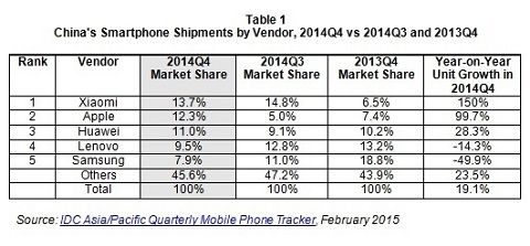 À̰°Àº Á¡À¯À²Àº Àü³â °°Àº ±â°£ ´ëºñ 49.9%Æ÷ÀÎÆ®³ª ¶³¾îÁø ¼öÄ¡·Î IDC´Â »ï¼ºÀüÀÚ°¡ Áß±¹ ÇöÁö Á¦Á¶»çµéÀÇ °Å¼¾ µµÀü¿¡ Á÷¸éÇß´Ù°í ºÐ¼®Çß´Ù. 2013³â 4ºÐ±â »ï¼ºÀüÀÚ´Â 18.8%ÀÇ Á¡À¯À²·Î ·¹³ë¹ö(13.2%)¿Í È¿þÀÌ(10.2), ¾ÖÇÃ(7.4%), »þ¿À¹Ì(6.5%) µîÀ» ´©¸£°í Á¡À¯À² 1À§¸¦ Â÷ÁöÇÑ ¹Ù ÀÖ´Ù.