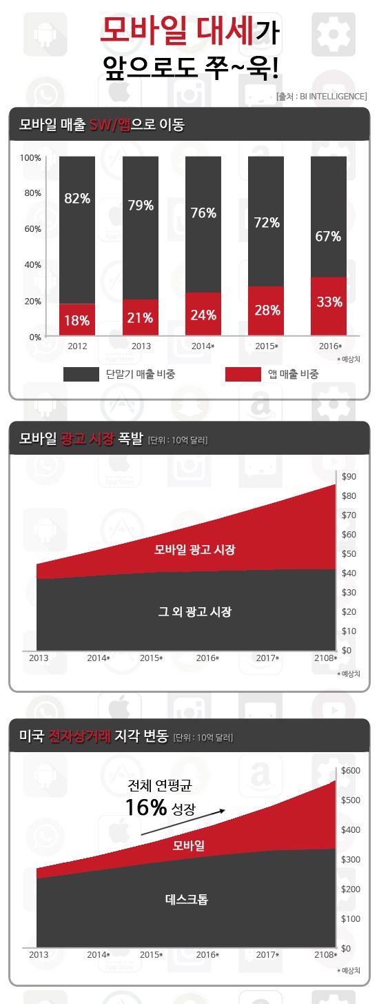 ±¤°í¿Í ÀüÀÚ»ó°Å·¡ ÂÊ¿¡¼´Â ¸ð¹ÙÀÏ ¹Ù¶÷ÀÌ °ÇÏ°Ô ºÒ °ÍÀ¸·Î Àü¸ÁµÆ´Ù. ±×¸²¿¡¼ º¼ ¼ö ÀÖ´Â °Íó·³ ±¤°í ½ÃÀå°ú ÀüÀÚ»ó°Å·¡ ÂÊÀº ¸ð¹ÙÀÏ ÀÌ¿Ü ºÎ¹®Àº °ÅÀÇ Á¦ÀÚ¸® °ÉÀ½¿¡ ¸Ó¹°°í ÀÖ´Â °¡¿îµ¥ ¸ð¹ÙÀÏ ÂÊÀº °¡ÆÄ¸¥ »ó½Â¼¼¸¦ ±¸°¡ÇÒ °ÍÀ¸·Î Àü¸ÁµÆ´Ù.