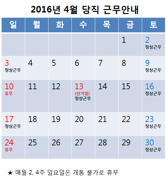 [2016³â 4¿ù ÁÖ¸» ¹× °øÈÞÀÏ ´çÁ÷±Ù¹« ¾È³»]