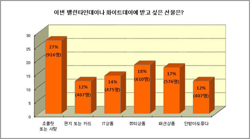 ¡ÞÃÊÄݸ´À̳ª »çÅÁ °¡Àå ¼±È£=À̹ø ¹ë·±Å¸Àε¥À̳ª È­ÀÌÆ®µ¥ÀÌ¿¡ ¹Þ°í ½ÍÀº ¼±¹° 1À§´Â ¡®ÃÊÄݸ´ ¶Ç´Â »çÅÁ¡¯(27%, 916¸í)ÀÌ Â÷ÁöÇß´Ù.