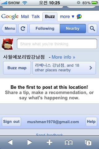 Áö¸ÞÀÏ¿¡¼­´Â ¾ÆÁ÷ ÀÌ¿ëÇÒ ¼ö ¾øÁö¸¸, ±¸±Û¹öÁî ¸ð¹ÙÀÏ ¼­ºñ½º´Â ¾ÆÀÌÆù°ú ¾Èµå·ÎÀ̵åÆù¿¡¼­ ¹Ù·Î ÀÌ¿ëÇÒ ¼ö°¡ ÀÖ½À´Ï´Ù. ÀÏ´Ü ÈÞ´ëÆù ºê¶ó¿ìÀú¿¡¼­ http://m.google.com/buzz ·Î Á¢¼ÓÇÏ½Ã¸é ¹Ù·Î À̿밡´ÉÇϳ׿ä. ÇöÀç ¸ð¹ÙÀÏ¿¡¼­´Â Æ®À§ÅÍ µîÀº ¿¬µ¿ÇÒ ¼ö ¾ø°í, ÀÚ½ÅÀÇ »óŸ¦ ¾÷µ¥ÀÌÆ®ÇÏ´Â °Í¸¸ °¡´ÉÇÕ´Ï´Ù.