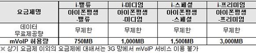 KT°¡ ¿¹°í´ë·Î 6ÀϺÎÅÍ i-¹ë·ù ÀÌ»ó ¿ä±ÝÁ¦ »ç¿ëÀÚ¿¡ ÇÑÇØ ¸ð¹ÙÀÏ ÀÎÅÍ³Ý ÀüÈ­(m-VoIP)¸¦ Çã¿ëÇß´Ù. µ¿½Ã¿¡ ÇØ´ç ¿ä±ÝÁ¦¸¦ »ç¿ëÇÏÁö ¾Ê´Â °í°´µéÀº 3G ¸Á¿¡¼­ ÀÎÅÍ³Ý ÀüÈ­¸¦ »ç¿ëÇÒ ¼ö ¾øµµ·Ï Â÷´Ü Á¶Ä¡°¡ ³»·ÁÁ³´Ù.