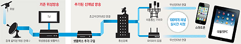 ±âÁ¸ÀÇ À§¼º¹æ¼ÛÀº Áý¿¡ ¼³Ä¡µÈ À§¼º ¾ÈÅ׳ª°¡ ¹æ¼Û ½ÅÈ£¸¦ ¹Þ¾Æ ¼ÂÅé¹Ú½º·Î Àü´ÞÇϸé À̸¦ TV¿¡¼ º¸¿©ÁÖ´Â °ÍÀ̾ú´Ù. »õ ±â¼úÀº ¿©±â¿¡ ¼ÂÅé¹Ú½º¸¦ Çϳª ´õ Ãß°¡ÇØ ¶È°°Àº ¹æ¼Û½ÅÈ£¸¦ ÀÎÅÍ³Ý °ø°£¿¡µµ µ¿½Ã¿¡ »Ñ¸®°í À̸¦ ½º¸¶Æ®ÆùÀÌ ¹Þ¾Æ³»µµ·Ï ÇÏ´Â °ÍÀÌ´Ù. µû¶ó¼ Áý¿¡¼ TV¸¦ ÄѳõÁö ¾Ê¾Æµµ µÎ ¼ÂÅé¹Ú½º¿¡ Àü¿øÀÌ µé¾î¿Í ÀÖÀ¸¸é Áý ¹Û¿¡¼ ÀÚÀ¯·Ó°Ô ½º¸¶Æ®ÆùÀ» ÅëÇØ TV¸¦ º¼ ¼ö ÀÖ´Ù. ¿ÍÀÌÆÄÀ̰¡ °¡´ÉÇÑ Áö¿ªÀ̶ó¸é ÇØ¿Ü ÃâÀåÀ» °¡¼µµ Çѱ¹ÀÇ ¹æ¼Ûä³ÎÀ» °ÅÀÇ ½Ç½Ã°£À¸·Î º¼ ¼ö ÀÖ´Ù.