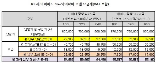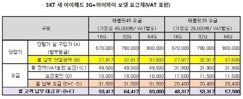 SKÅÚ·¹ÄÞ°ú KT ¸ðµÎ »õ ¾ÆÀÌÆÐµå ½Ç±¸ÀÔ°¡(ÇҺοø±Ý)Àº ¶È°°´Ù. ¿ä±ÝÇÒÀÎÀ» Á¦¿ÜÇÑ Åë½Å»ç ´Ü¸»±â Áö¿øÀÌ µé¾î°£ »õ ¾ÆÀÌÆÐµå(3G+¿ÍÀÌÆÄÀÌ)ÀÇ ½Ç±¸ÀÔ°¡´Â 16GB 67¸¸¿ø, 32GB 79¸¸¿ø, 64GB 90¸¸¿øÀÌ´Ù.