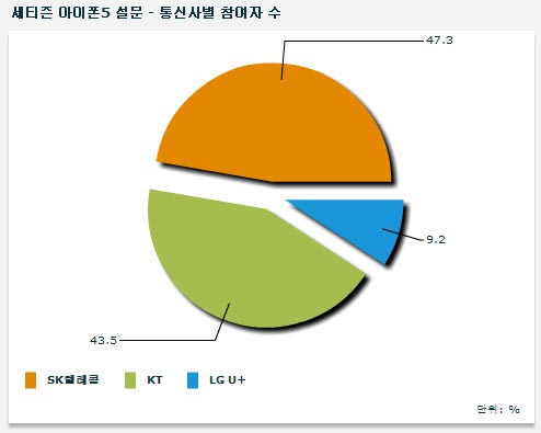 Á¶»ç °á°ú ÃÑ ÀÀ´äÀÚ 3,395¸í Áß 2,183Ç¥, Àý¹Ý ÀÌ»óÀÎ 64%°¡ SKÅÚ·¹ÄÞÀ» ÅÃÇß´Ù. ¹Ý¸é KT´Â 1,212¸íÀÌ ¼±ÅÃÇØ 36%¿¡ ¸Ó¹°·¶´Ù.