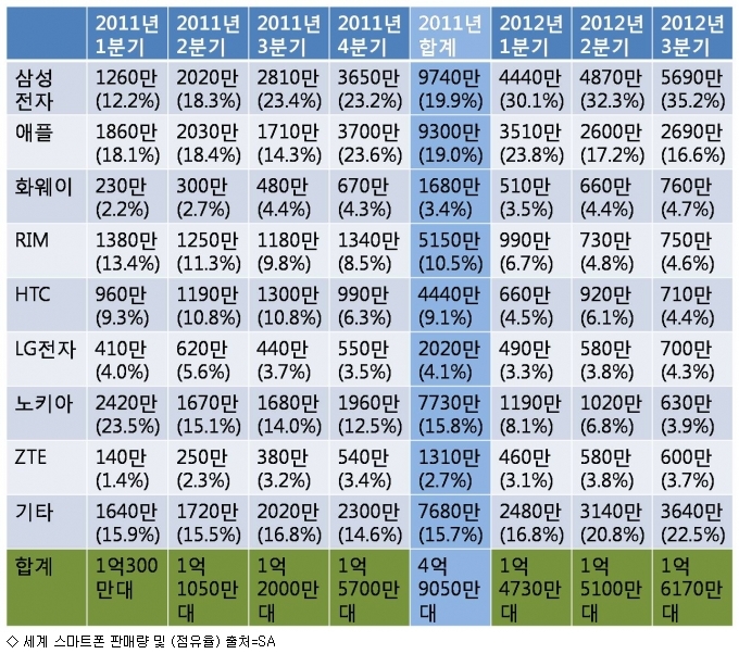 3ºÐ±â 1À§ ½º¸¶Æ®Æù ¾÷ü´Â ¿ª½Ã »ï¼ºÀüÀÚ. ÇØ´ç ºÐ±â¿¡¸¸ 5õ690¸¸´ëÀÇ ½º¸¶Æ®ÆùÀ» ÆÇ¸ÅÇϸç 35.2%ÀÇ Á¡À¯À²À» ³ªÅ¸³Â´Ù. ¾ÖÇõµ 2õ690¸¸´ëÀÇ ¾ÆÀÌÆùÀ» ÆÇ¸ÅÇØ 16.6%·Î 2À§¸¦ À̾ú´Ù.