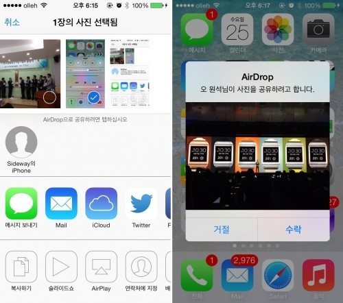Á¦¾î¼¾ÅÍ¿¡¼­ ¿¡¾îµå·ÓÀ» ÄÒ ´ÙÀ½ »çÁøÀ̳ª ¹®¼­ µîÀÇ ÆÄÀÏÀ» °ñ¶ó °øÀ¯ÇÏ·Á°í Çϸé e¸ÞÀÏ, ¹®ÀÚ¸Þ½ÃÁö, ¾ÆÀÌŬ¶ó¿ìµå µî ±âÁ¸¿¡ ¾²´ø °Í ¿Ü¿¡ ¿¡¾îµå·ÓÀÌ º¸ÀδÙ. ¸ñ·Ï¿¡ ÁÖº¯¿¡¼­ ¿¡¾îµå·ÓÀ» ¾µ ¼ö ÀÖ´Â À̵éÀÇ ±â±â°¡ º¸ÀÌ°í º¸³¾ »ç¶÷À» ¼±ÅÃÇÏ¸é ¹Ù·Î ÆÄÀÏÀÌ Àü¼ÛµÈ´Ù. ÇÑ ¹ø¿¡ ¿©·¯ ¸í¿¡°Ô º¸³¾ ¼öµµ ÀÖ´Ù. ¾ÖÇÃÀÌ ±»ÀÌ NFC¿¡ ¼­µÎ¸£Áö ¾Ê´Â °Íµµ ¿¡¾îµå·Óó·³ °£´ÜÈ÷ ¼ÒÇÁÆ®¿þ¾î·Î ¿øÇÏ´Â Á¤º¸µéÀ» °øÀ¯ÇÒ ¼ö Àֱ⠶§¹®ÀÌ´Ù.