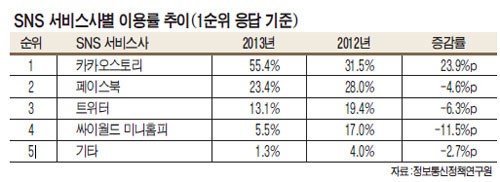 SNS Áß¿¡¼´Â īī¿À½ºÅ丮°¡ 55.4%·Î 1À§¸¦ Â÷ÁöÇß°í, ÆäÀ̽ººÏ, Æ®À§ÅÍ, ½ÎÀÌ¿ùµå ¹Ì´ÏȨÇǰ¡ µÚ¸¦ À̾ú´Ù. īī¿À½ºÅ丮´Â 2012³â 31.5%¿¡¼ 2013³â 55.4%·Î 23.9%Æ÷ÀÎÆ® Áõ°¡ÇÑ ¹Ý¸é, ÆäÀ̽ººÏ, Æ®À§ÅÍ µî ´Ù¸¥ SNS ¼ºñ½º´Â ¸ðµÎ °¨¼ÒÇØ ¼ºñ½ºº° ÀÌ¿ë·ü °ÝÂ÷°¡ Ä¿Áø °ÍÀ¸·Î ³ªÅ¸³µ´Ù.