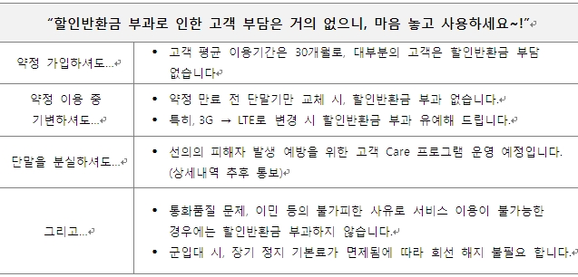 1.¡®¾àÁ¤ÇÒÀÎÁ¦µµ¡¯ µµÀÔ ÃëÁö´Â ¹«¾ùÀΰ¡¿ä? ±âÁ¸ ÇÒÀÎÁ¦µµ´Â ¡®»õ·Î¿î ´Ü¸»±â¸¦ ½Å±Ô / ±â±âº¯°æ ½Ã ÇҺΠ±¸¸ÅÇÏ´Â Á¶°Ç¡¯À¸·Î ÇÒÀÎ ÇýÅÃÀ» Á¦°øÇØÁÖ´Â º¸Á¶±Ý ¼º°ÝÀÇ ¿ä±Ý ÇÒÀÎÀ¸·Î ÇýÅÃÀ» ¹Þ´Â °í°´ÀÌ Á¦ÇÑÀûÀ̾ú½À´Ï´Ù. ¹Ý¸é, À̹ø¿¡ ½Å¼³µÈ ¾àÁ¤ÇÒÀÎÁ¦µµ´Â ´Ü¸» ÇҺΠ±¸ÀÔ µî¿¡ »ó°ü ¾øÀÌ Æ¯Á¤ ¿ä±ÝÁ¦¸¦ ÀÏÁ¤ ±â°£ µ¿¾È ¾àÁ¤ ÀÌ¿ëÇÏ´Â °í°´ ´©±¸¿¡°Ô³ª ÇÒÀÎ ÇýÅÃÀ» Á¦°øÇØ µå¸³´Ï´Ù. - Áß°í´Ü¸», ¿Ü»ê´Ü¸», Àڱ޴ܸ», ÇÒÀÎÁ¦µµ ¸¸·á °í°´ µî ±âÁ¸¿¡ ¿ä±Ý ÇÒÀÎ ºñ´ë»ó °í°´¿¡°Ôµµ ¾àÁ¤ ÇÒÀÎ ÇýÅÃÀ» Á¦°ø 2.¡®¾àÁ¤ÇÒÀÎÁ¦µµ¡¯°¡ ±âÁ¸ ÇÒÀÎÁ¦µµ ´ëºñ °í°´ ÇýÅÃÀÌ ÁÁ¾ÆÁø Á¡Àº ¹«¾ùÀΰ¡¿ä? ±âÁ¸ ÇÒÀÎ±Ý¾× ¼öÁØÀº À¯ÁöÇÏ¸é¼ ´Ü¸» ¹× ÃÖ´ë ÇÒÀÎ ±â°£ Á¦ÇÑ Á¶°ÇÀ» Àû¿ëÇÏÁö ¾Ê¾Æ, ¿ä±Ý ÇÒÀÎ ÇýÅà ¼öÇý °í°´ÀÇ ¹üÀ§°¡ ´õ¿í È®´ëµÇ¾ú½À´Ï´Ù. ¡Ø ÃÖ´ëÇÒÀÎ ±â°£ º¯°æ ¢º ±âÁ¸ : ÃÖ´ë 24(´õºí)/36(½ºÆä¼È)/30(LTE) °³¿ù ±îÁö¸¸ ÇýÅà Á¦°ø ¢º º¯°æ : Àç¾àÁ¤À» ÅëÇØ 1³â/2³â ´ÜÀ§·Î °í°´ÀÌ ¿øÇÏ¸é °è¼ÓÇØ¼ ÇÒÀÎÁ¦°øÀÌ °¡´ÉÇÕ´Ï´Ù. (ÃÖ´ë ÇÒÀÎ ±â°£ Á¦ÇÑ ¾øÀ½) 3. ±âÁ¸ ÇÒÀÎÁ¦µµ ´ëºñ »õ·Ó°Ô ½ÃÇàµÇ´Â ¡®¾àÁ¤ÇÒÀÎÁ¦µµ¡¯ÀÇ Â÷ÀÌÁ¡Àº ¹«¾ùÀΰ¡¿ä? ¿ì¼± ±âÁ¸ ÇÒÀÎ ÇÁ·Î±×·¥(½ºÆä¼È/´õºí/¿ì·®°í°´/LTEÇ÷¯½ºÇÒÀÎ)´Â ¸ðµÎ 7/1ÀÏ ÀÌÈÄ °¡ÀÔ Áß´Ü(¼¼ºÎ ½ÃÇàÀÏ º°µµ °øÁö ¿¹Á¤) µÇ°í,¡®½ºÆä¼È ¾àÁ¤ÇÒÀÎÁ¦µµ & LTE Ç÷¯½º ¾àÁ¤ÇÒÀÎÁ¦µµ¡¯·Î ÅëÇյ˴ϴÙ. °¡ÀÔ Á¶°ÇÀº ±âÁ¸ ´Ü¸» ÇҺΠ±¸¸Å & ½Å±Ô/±âº¯ ÈÄ 1°³¿ù À̳» °¡ÀÔ (½ºÆä¼ÈÇÒÀÎ), TÇÒºÎ/T±âº»¾àÁ¤ °¡ÀÔ (´õºíÇÒÀÎ), ÀÌ¿ë ±â°£ 2³â ÀÌ»ó (¿ì·®°í°´ÇÒÀÎ) ´ë½Å¿¡ ¿ä±Ý¾àÁ¤ÇÒÀÎÁ¦µµ ´ë»ó ¿ä±ÝÁ¦ ÀÌ¿ë & ±â°£ ¾àÁ¤ Á¶°ÇÀ¸·Î º¯°æµË´Ï´Ù. ÇÒÀÎ ±â°£Àº ±âÁ¸ ÃÖÀå 36°³¿ù(½ºÆä¼È), 30°³¿ù(LTE)¿¡¼ ¡®12°³¿ù or 24°³¿ù Áß ¼±Åá¯ÇÏ´Â °ÍÀ¸·Î º¯°æµÇ¾ú½À´Ï´Ù. ÇÏÁö¸¸ ¾àÁ¤ ¸¸·á ÈÄ¿¡µµ °í°´ÀÌ ¿øÇϸé Àç¾àÁ¤À» ÅëÇØ °è¼ÓÇØ¼ ¿ä±Ý ÇÒÀÎ ÇýÅÃÀ» ¹ÞÀ» ¼ö ÀÖ½À´Ï´Ù. (´Ü, ½Å¼³µÈ ¾àÁ¤ÇÒÀÎÁ¦µµ´Â ¾àÁ¤ ÇØÁö ½Ã, ÇÒÀιÝȯ±ÝÀÌ ºÎ°úµË´Ï´Ù.) 4. ÇÒÀιÝȯ±ÝÀº ¿Ö ºÎ°úÇϳª¿ä? ±âÁ¸ ÇÒÀÎÁ¦µµ´Â ¡®´Ü¸» ±¸¸Å °í°´¡¯À¸·Î °¡ÀÔ ´ë»óÀ» Á¦ÇÑÇÏ¿© º¸Á¶±Ý ÇüÅ·ΠÇÒÀÎ ÇýÅÃÀ» Á¦°øÇßÁö¸¸, »õ·Ó°Ô ½ÃÇàµÇ´Â ¾àÁ¤ÇÒÀÎÁ¦µµ´Â ƯÁ¤ ¿ä±ÝÁ¦ÀÇ ÀÌ¿ë ±â°£À» ¾àÁ¤ÇÏ´Â °í°´ÀÌ¸é ´©±¸³ª °¡ÀÔ °¡´ÉÇÑ °ÍÀ¸·Î, ¾àÁ¤ ±â°£ ¹Ì Áؼö¿¡ ´ëÇÑ ÇÒÀιÝȯ±Ý ºÎ°ú´Â ºÒ°¡ÇÇÇÕ´Ï´Ù. - ±âÁ¸ ÇÒÀÎÁ¦µµ´Â ¡®´Ü¸» ÇҺΠ¹× º¸Á¶±Ý ¾àÁ¤ µîÀ» Á¶°ÇÀ¸·Î ´ç»ç¸¦ ÅëÇØ À¯ÅëµÇ´Â New ´Ü¸»À» ½Å±Ô/±âº¯ ½Ã ±¸¸ÅÇÑ °í°´¡¯¿¡ ÇÑÁ¤ÇÏ¿© ÇÒÀÎ ÇýÅÃÀ» Á¦°øÇßÀ¸³ª, ¾àÁ¤ÇÒÀÎÁ¦µµ´Â ¡®´Ü¸» Á¶°Ç ¾øÀÌ ÀÏÁ¤ ±â°£ µ¿¾È ƯÁ¤ ¿ä±ÝÁ¦¸¦ ÀÌ¿ëÇÒ °ÍÀ» ¾àÁ¤¡¯ÇÏ´Â ¹æ½ÄÀ¸·Î, ÇâÈÄ ¹ß»ýÇÒ ±â´ë ¿ä±ÝÀÇ ÀϺθ¦ ¿ä±Ý ÇÒÀÎ ÇýÅÃÀ¸·Î Á¦°øÇÏ´Â °ÍÀÔ´Ï´Ù. ÀÌ¿ë ±â°£ ¾àÁ¤¿¡ µû¸¥ ÇÒÀιÝȯ±Ý ºÎ°ú´Â ±âÁ¸ ¡®¿ì·®°í°´¿ä±ÝÇÒÀÎÁ¦µµ¡¯¿¡¼ ÀÌ¹Ì Àû¿ëµÈ ¹Ù ÀÖÀ¸¸ç, À¯¼± Ãʰí¼Ó ÀÎÅÍ³Ý »óǰ µî¿¡¼µµ º¸ÆíÀûÀ¸·Î Àû¿ëµÇ°í ÀÖ½À´Ï´Ù. ¶ÇÇÑ, ÇÒÀιÝȯ±ÝÀº ÇØ¿Ü À̵¿Åë½Å ½ÃÀå¿¡¼µµ ÀϹÝÀûÀ¸·Î ½ÃÇàµÇ´Â Á¦µµÀÔ´Ï´Ù. ¿¹¸¦ µé¾î, ÀϺ» ÀÌÅë»ç´Â ¾àÁ¤±â°£ À̳» ÇØÁö ¶Ç´Â ¾àÁ¤ ºñ´ë»ó ¿ä±ÝÁ¦·Î º¯°æ ½Ã ÀÌ¿ë ±â°£¿¡ °ü°è¾øÀÌ ¾à ¡Í10,000(¾à 15¸¸¿ø)ÀÇ ÇÒÀιÝȯ±ÝÀ» ºÎ°úÇϰí ÀÖ½À´Ï´Ù. 5. ÇÒÀιÝȯ±Ý ±Ô¸ð°¡ ³Ê¹« Å« °Í ¾Æ´Ñ°¡¿ä? °í°´ÀÇ ÇÒÀιÝȯ±Ý ºÎ´ãÀ» ÃÖ¼ÒÈÇϱâ À§ÇØ ¡®ÀÌ¿ë ±â°£¿¡ µû¶ó ÇÒÀιÝȯ±Ý ºÎ°ú ºñÀ²ÀÌ ³·¾ÆÁöµµ·Ï ÇÒÀιÝȯ±Ý »ê½Ä¡¯À» ¼³°èÇÏ¿´½À´Ï´Ù. 24°³¿ù Â÷ ÃÑ¿ä±ÝÇÒÀÎ±Ý¾× ´ëºñ ÇÒÀιÝȯ±Ý ºñÀ²Àº ÃÖÀú 31%·Î½á ±âÁ¸ ¿ì·®°í°´¿ä±ÝÇÒÀÎ µî Ÿ »óǰ¿¡ ºñÇØ ³·Àº ¼öÁØÀ¸·Î ¼³°èÇÏ¿´½À´Ï´Ù. ![]() 6. ȸ¼±À» ÇØÁöÇÏÁöµµ ¾Ê¾Ò´Âµ¥ ¿Ö ÇÒÀιÝȯ±ÝÀ» ºÎ¿©Çϳª¿ä? (Á¾·®ÇüÀ¸·Î ¿ä±ÝÁ¦ º¯°æ, LTE ¡æ 3G ¿ä±ÝÁ¦·Î º¯°æ, À̵¿ÀüÈ ¡ê ÅÂºí¸´ ¿ä±ÝÁ¦ °£ º¯°æ ½Ã, ÇÒÀιÝȯ±Ý ºÎ°ú) ¾àÁ¤ÇÒÀÎÁ¦µµ´Â ƯÁ¤ ¿ä±ÝÁ¦¸¦ ÀÏÁ¤ ±â°£µ¿¾È ÀÌ¿ëÇÒ °ÍÀ» ¾à¼ÓÇÏ´Â °æ¿ì, ÀÌ¿¡ ´ëÇÑ ¹Ì·¡ ¿ä±Ý ¼öÀÍ¿¡ ±â¹ÝÇÏ¿© ¿ä±Ý ÇÒÀÎ ÇýÅÃÀ» Á¦°øÇØÁÖ´Â °ÍÀÔ´Ï´Ù. ÀÌ¿¡ µû¶ó, ¾àÁ¤ÇÒÀÎÁ¦µµ º°·Î ¿ä±Ý ÇÒÀÎ ¼öÁØÀÌ ¸ðµÎ ´Ù¸£°Ô ¼³°èµÇ¾î ÀÖ½À´Ï´Ù. Áï, Á¾·®Çü ¿ä±ÝÁ¦ µîÀ¸·Î º¯°æ ¶Ç´Â LTE ¡æ 3G ¿ä±ÝÁ¦·Î º¯°æ ½Ã, ¿ä±ÝÇÒ