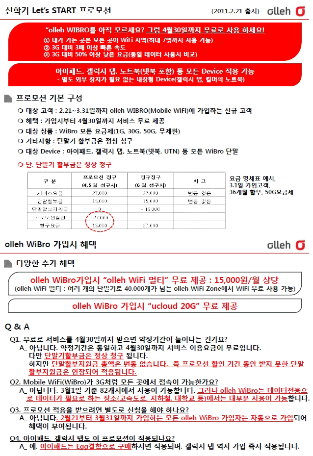 ¡Ý ´ë»ó°í°´ : 2011.02.21 ~ 3.31ÀϱîÁö olleh WiBro¿¡ °¡ÀÔÇÏ´Â °í°´ ¡Ý ÇýÅà : °¡ÀԽúÎÅÍ 4¿ù30ÀϱîÁö ¼ºñ½º ¹«·áÁ¦°ø ¡Ý ´ë»ó»óǰ : WiBro ¸ðµç ¿ä±ÝÁ¦(1G, 30G, 50G, ¹«Á¦ÇÑ) ¡Ý ´ë»ó±â±â : °¶·°½ÃÅÇ,iPAD µî WiBro ¸ðµç »óǰ ¡Ý ´Ü¸»±â ÇҺαÝÀº Á¤»óû±¸ µÇ³ª ÇÁ·Î¸ð¼Ç ÇÒÀÎÀ¸·Î ¿ä±ÝÀº °øÂ¥! ¡Ø ´Ü, ´Ü¸»±â ÇҺαÝ(±â±â°ª)Àº Á¤»ó û±¸µË´Ï´Ù.