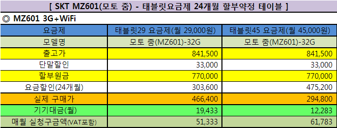 SKT ¸ðÅäÁÜ(MZ601) - ÅÂºí¸´ 24°³¿ù ÇҺξàÁ¤ ¿ä±ÝÁ¦º° ÆÇ¸Å°¡°ÝÇ¥ÀÔ´Ï´Ù. (* SKT´Â ÇҺα¸¸Å½Ã À¯ÀÌÀÚ Á¤Ã¥À¸·Î 5.9%ÀÇ ÇÒºÎÀÌÀÚ ºÎ°¡µÊ)